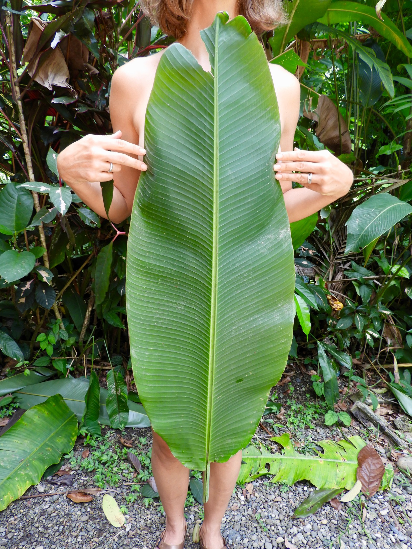 I love how willing my wife’s boobs are in having her naked breasts photographed in a variety of different poses and situations. She was completely naked outside again, but this time with a banana leaf covering her body from her shoulders down to her knees.