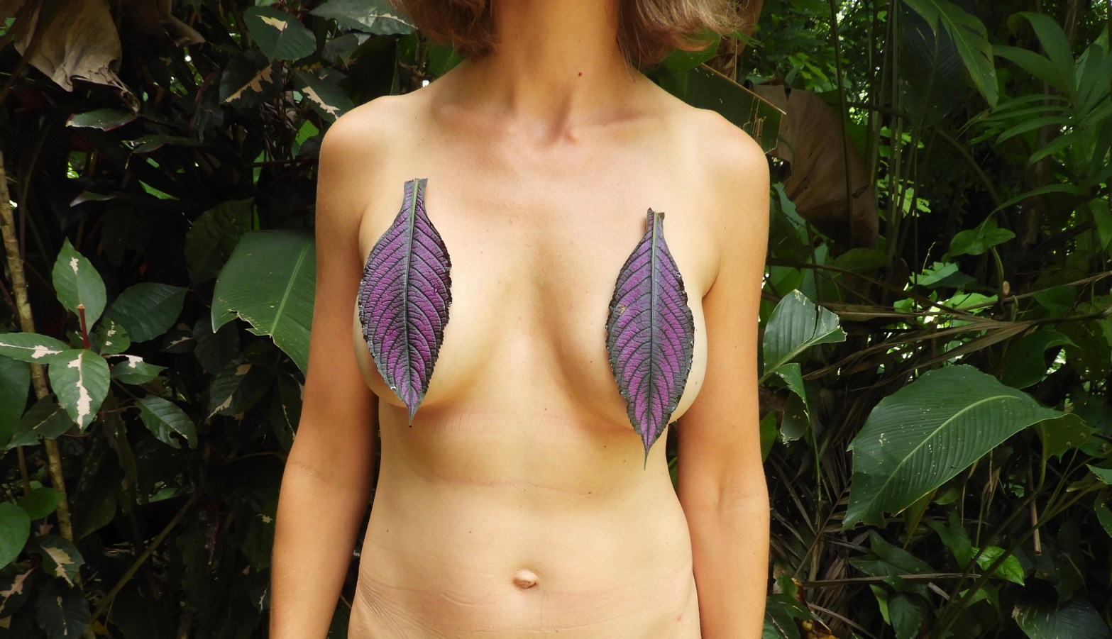 These purples leaves are naturally colored that way. And these leaves grow on a plant in our backyard. Not sure the name of the plant. And somehow my wife’s boobs got these purple leaves to stick naturally on her breasts without falling off.