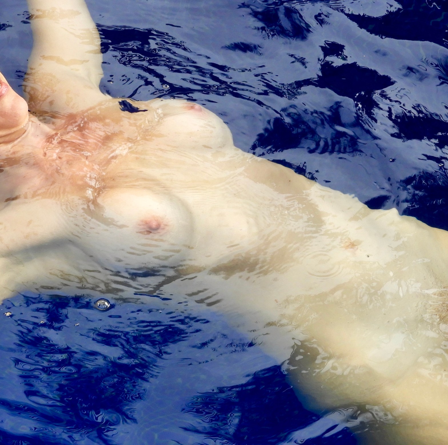 My wife’s boobs were floating naked in the pool with her tits and vagina showing. Her breasts most of the time were above the waterline with the water breaching around her boobs like two islands in the pool.
