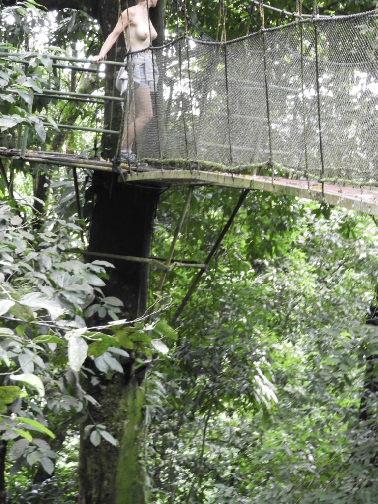My wife’s boobs walking topless on a hanging bridge through the jungle.